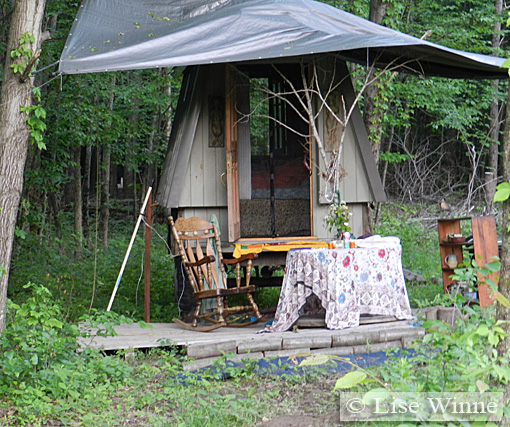 Before the bonfire gets lit with a torch thrown from a medieval-style catapult, I take a walk through the woods and find that there is a rather large campsite. Most of the camps are tents, but I found this cool caravan, complete with a couple of sculptures nailed to either side of the door: